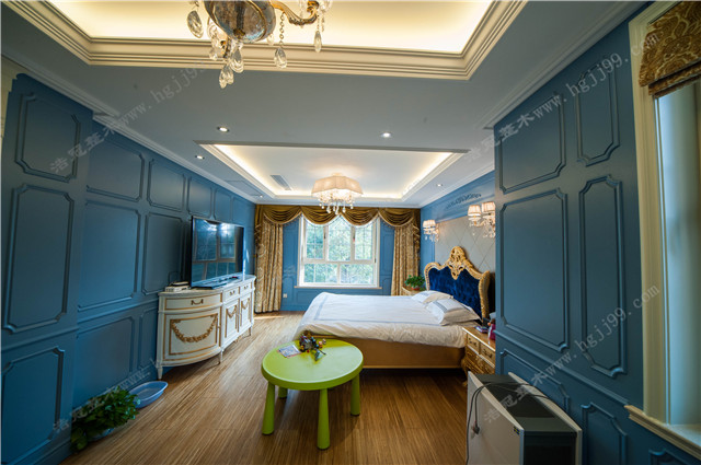 兒童房的護(hù)墻板則采用了藍(lán)色涂裝工藝,典雅且生機(jī)勃勃
